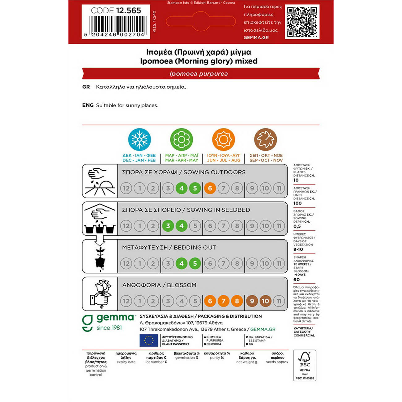 Αναρριχώμενο. Μονοετές. Kατάλληλο για ηλιόλουστα σημεία. Απόσταση φυτών (εκ.): 10. Απόσταση γραμμών (εκ.): 100. Βάθος σποράς (εκ.):0,5. Ημέρες φυτρώματος: 8-10. Έναρξη ανθοφορίας (ημέρες): 60. Ipomoea purpurea. C094