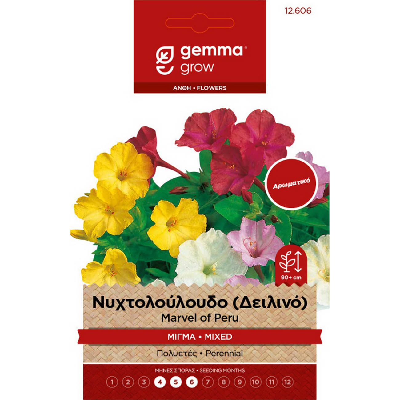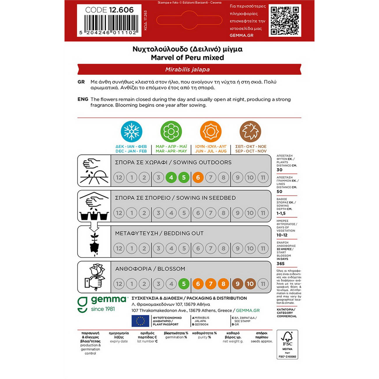 Αρωματικό. Πολυετές. Με άνθη συνήθως κλειστά στον ήλιο, που ανοίγουν τη νύχτα ή στη σκιά. Πολύ αρωματικά. Ανθίζει το επόμενο έτος από τη σπορά. Απόσταση φυτών (εκ.): 30. Απόσταση γραμμών (εκ.): 50. Βάθος σποράς (εκ.):1-1,5. Ημέρες φυτρώματος: 10-12. Έναρξη ανθοφορίας (ημέρες): 365. Mirabilis jalapa. B044