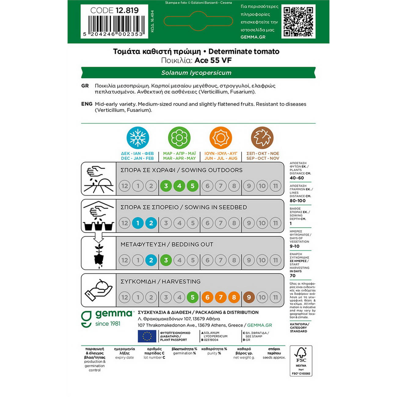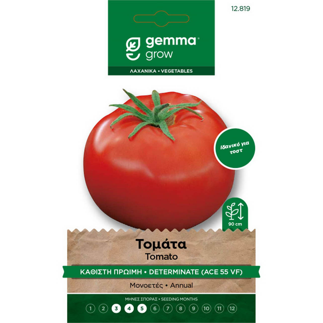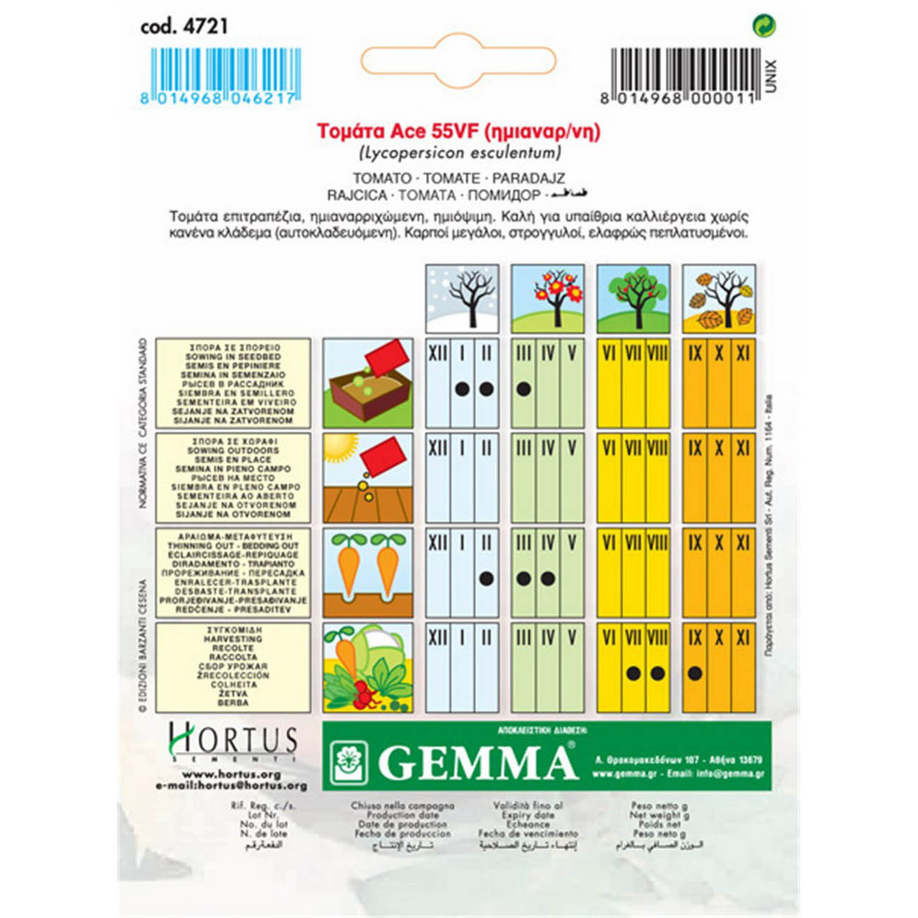 Ιδανικό για τοστ. Μονοετές. Ποικιλία μεσοπρώιμη. Καρποί μεσαίου μεγέθους, στρογγυλοί, ελαφρώς πεπλατυσμένοι. Ανθεκτική σε ασθένειες (Verticillium, Fusarium). Απόσταση φυτών (εκ.): 40-60. Απόσταση γραμμών (εκ.): 80-100. Βάθος σποράς (εκ.):1. Ημέρες φυτρώματος: 9-10. Έναρξη συγκομιδής (ημέρες): 70. Ποικιλία: Ace 55 VF. 4721