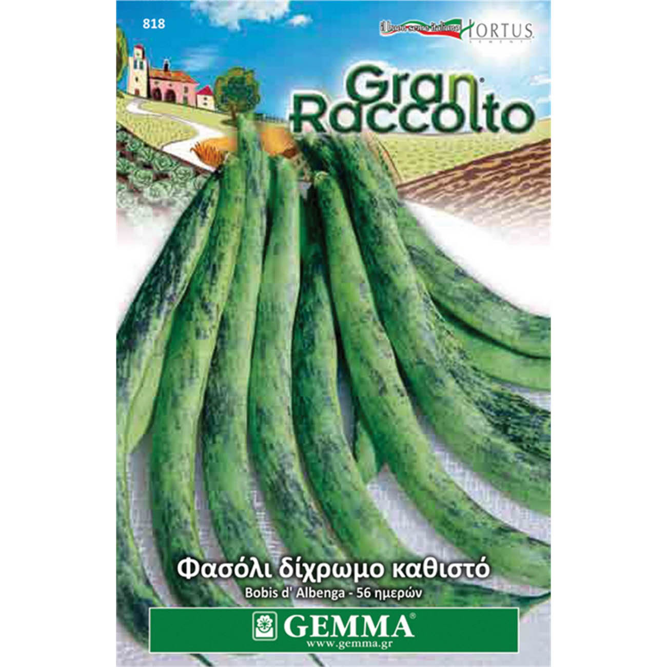 Φασόλι νάνο, άνευρο, με λοβό χρώματος πράσινου σκούρου, με ιώδεις ραβδώσεις, μακρύ και με καρπό κρεμ με καφέ στίγματα. Διατίθεται σε φάκελο των 65 g. 818