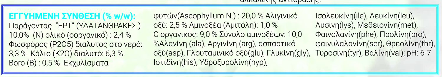 Βιοδιεγέρτης με ενσωματωμένη τεχνολογία ΕΡΤ, υψηλής αγγειακής και αντιοξειδωτικής ικανότητας. Ενισχύει τη σωστή λειτουργία (ξύλου και φλοιού) και βοηθά την ικανότητα παραγωγής των χυμών του φυτού. Ο συνδυασμός του με τα εκχυλίσματα θαλάσσιων φυκιών (ASCOPHYLLUM NODOSUM) αυξάνει την ταχύτητα απορρόφησης των θρεπτικών στοιχείων.